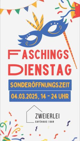 Sonderöffnung am Faschings-Dienstag, 17.02.2026: geöffnet von 14:30 - 24:00 Uhr. Tel +43 664 2514 002