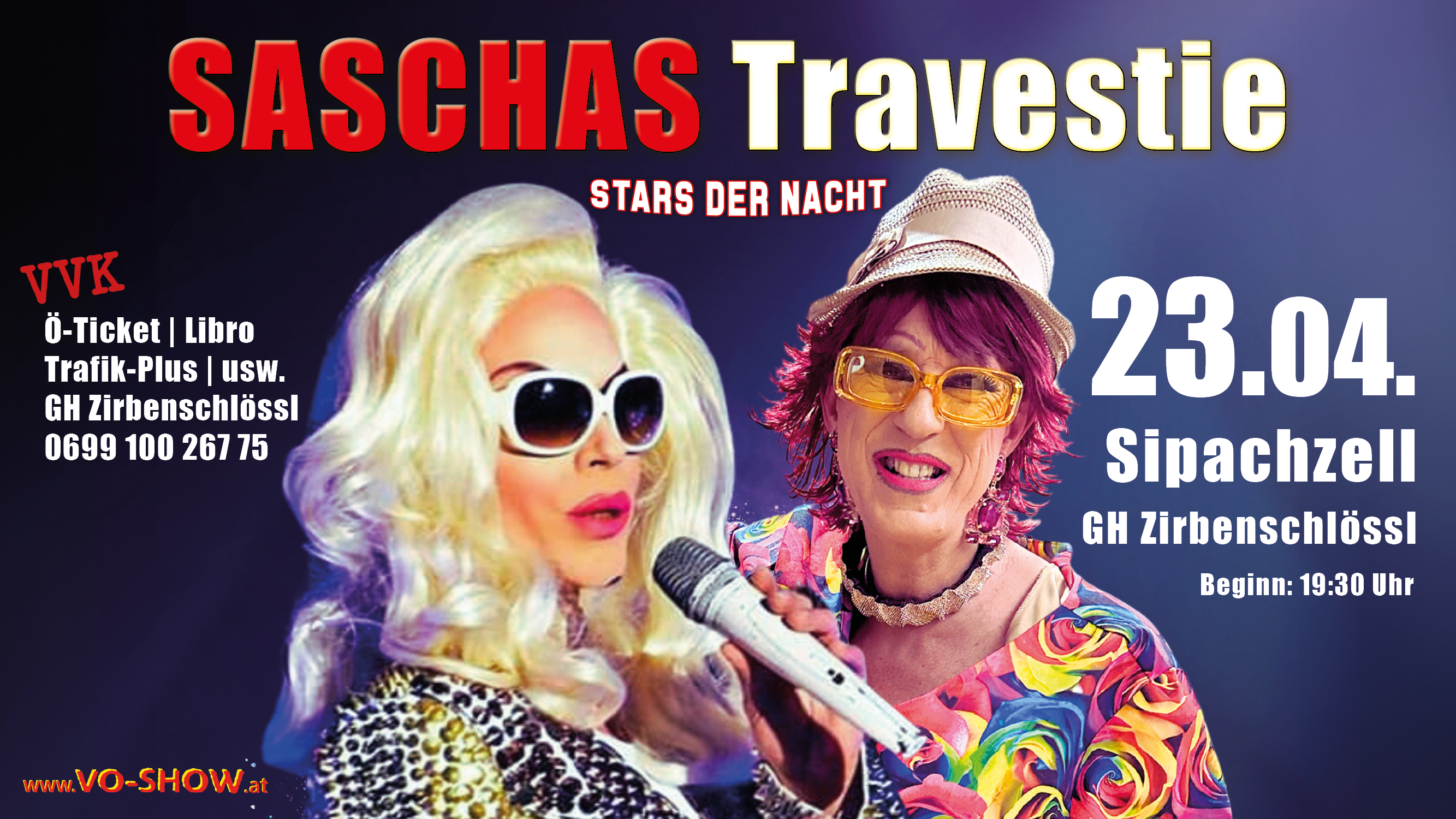 Ein Abend mit den Stars der Nacht - Travestie Sascha bedeutet: unvergessliche Stimmung, gemeinsanes Lachen und pure Freude! Showtime der extra Klasse im Zirbenschlössl in Sipachzell am 23.April 2026 um 19.30h ist Beginn und ab 18h gibt es ein 3 Gänge Menü Wahlweise zum Eintritt!