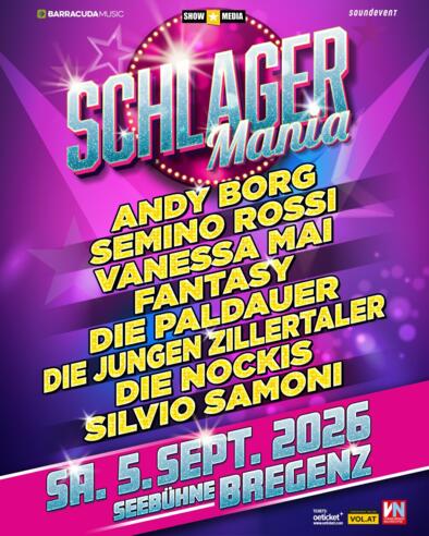 Die Schlagermania feiert am Samstag, 05. September 2026, ihr großes Comeback und verspricht ein wahres Gipfeltreffen der beliebtesten Schlagerstars unserer Zeit. Megastimmung ist garantiert – mit großen Hits, neuen Songs, Emotionen, Mitsingen, Tanzen und gemeinsamem Feiern vor der einzigartigen Kulisse des Bodensees.