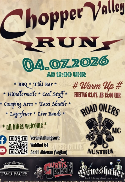 Am 04.07.2026 ab 12:00 Uhr veranstalten die Road Oilers wieder für Choppers und alle 2-Rad Enthusiasten nach dem Valley Run einen chilligen Nachmittag mit