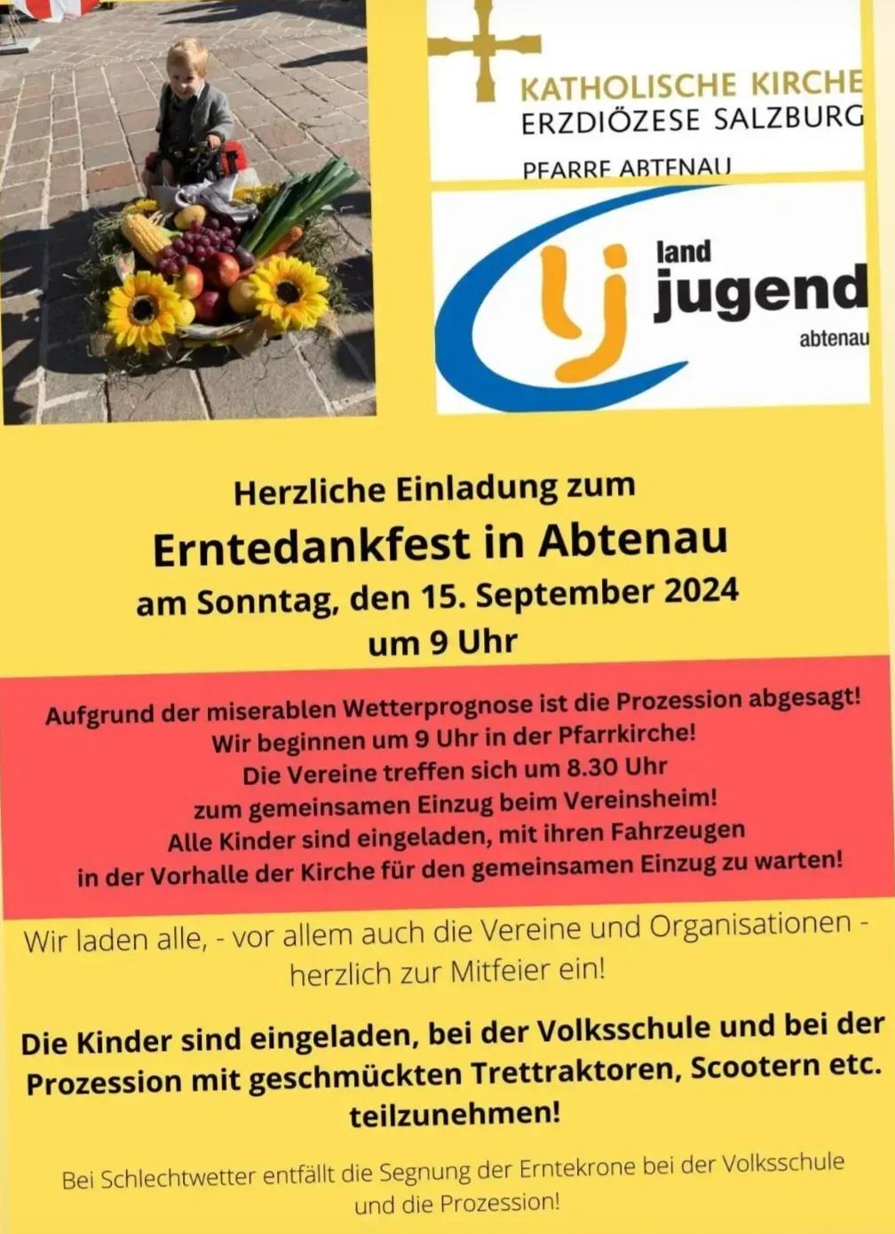 Feierlicher Gottesdienst mit Gabensegnung und Erntedank-Prozession.