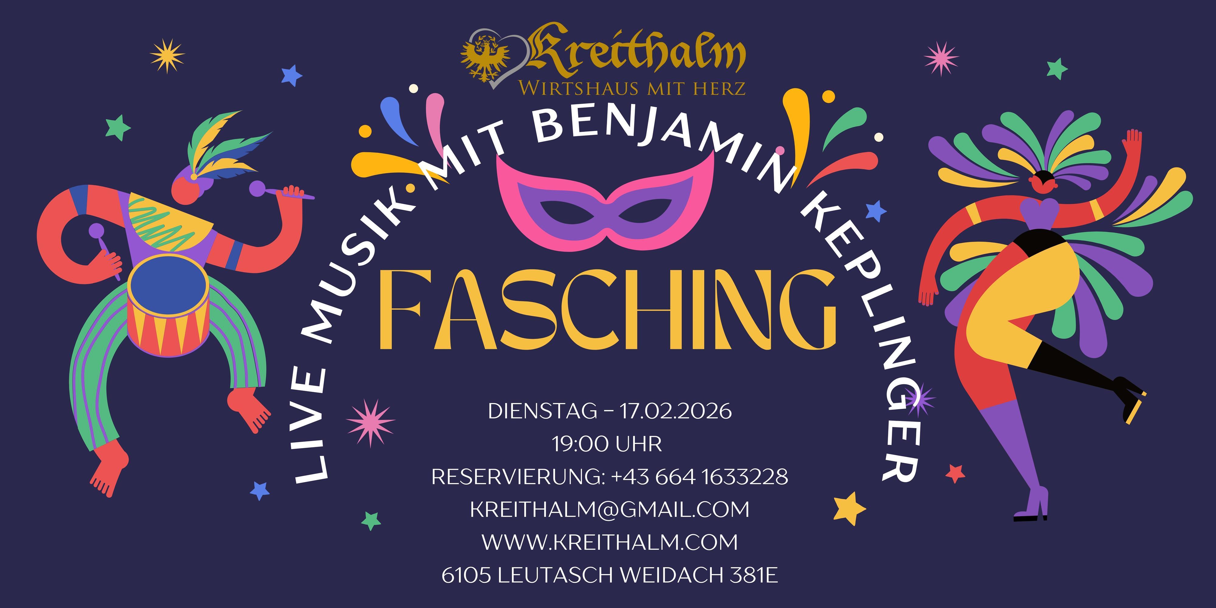 Am Dienstag, 17.02.2026 ab 19:00 Uhr laden wir herzlich zum Faschingsabend im Kreithalm ein!
