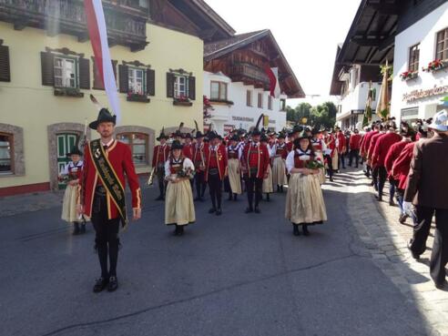 Hochamt in der Pfarrkirche, anschließend feierliche Prozession mit Musikkapelle und Schützen durch das Dorf. Ausklang der Feierlichkeiten im Musikpavillon.