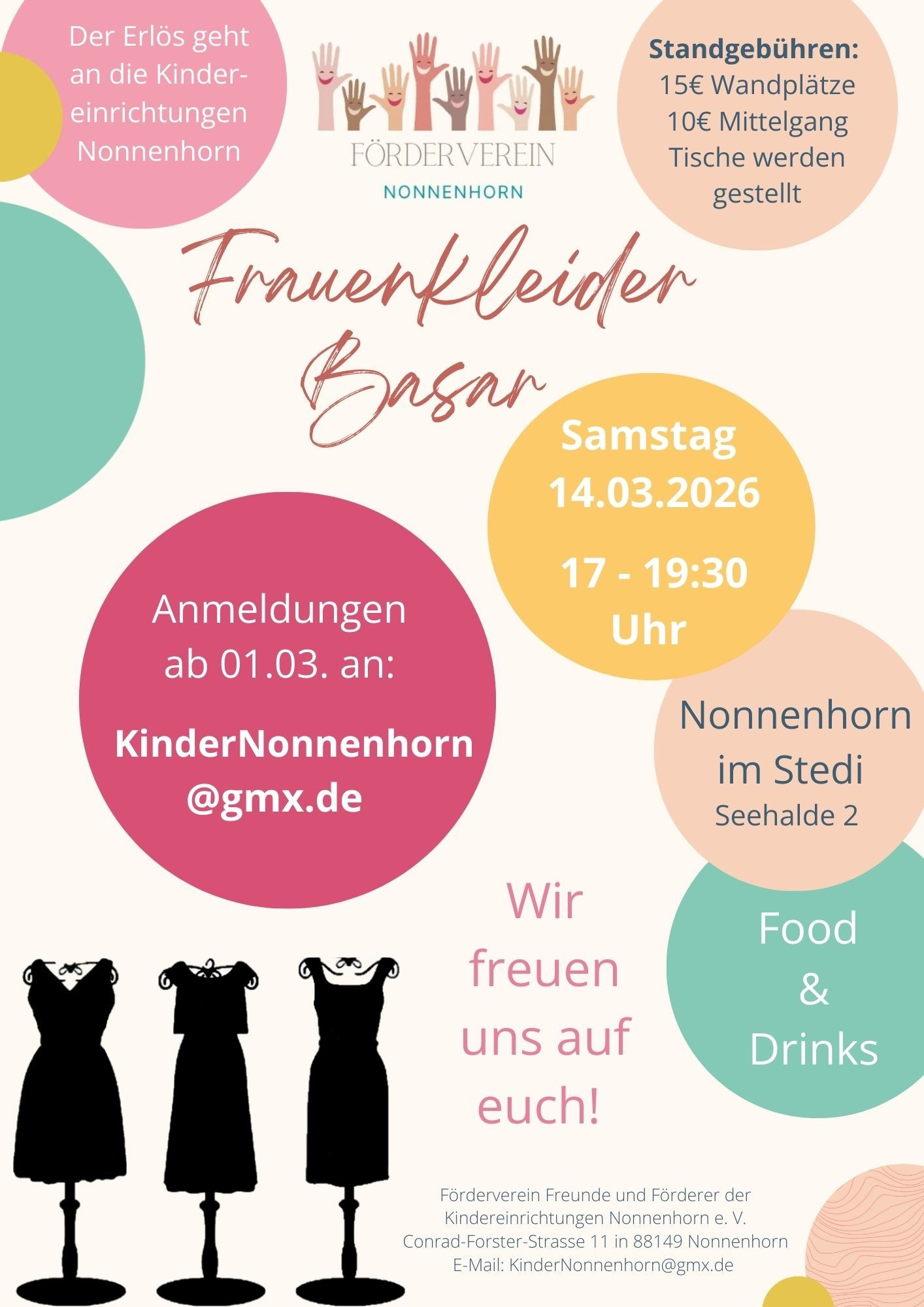 Frauenkleider Basar, der Erlös geht an die Kindereinrichtungen in Nonnenhorn. Für das leibliche Wohl ist natürlich gesorgt. Standgebühren 15,00 € Wandplätze und 10,00 € Mittelgang, Tische werden gestellt. Anmeldungen ab 01.03.2026 unter KinderNonnenhorn@gmx.de