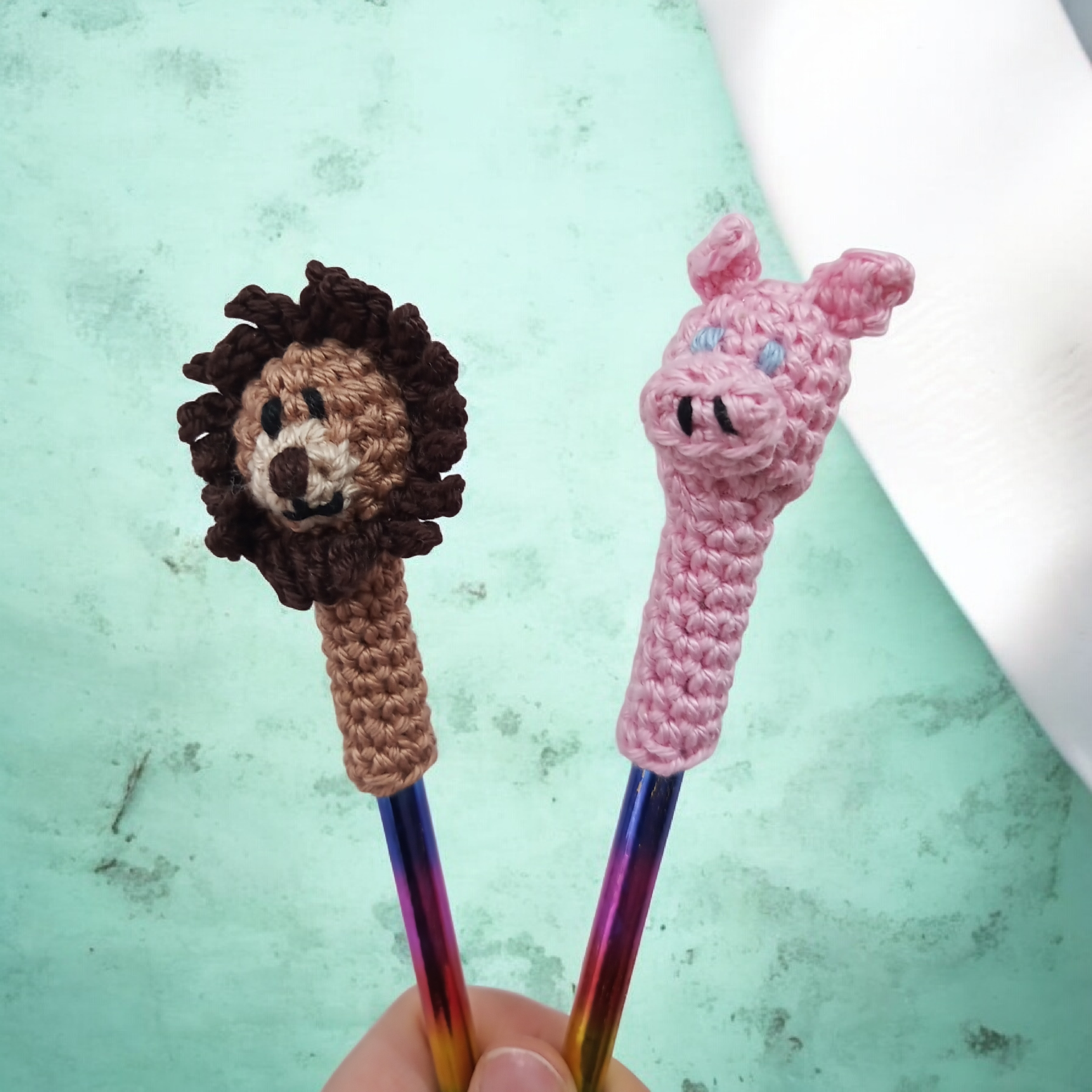 Zwei niedliche Motive werden in diesem Kurs gehäkelt. Die entweder für den Bleistift oder dünnen Buntstift verwendet werden kann. (Häkelgrundkenntnis sollte vorhanden sein! Mann sollte feste Masche, Luftmaschen und Kettenmaschen, schon häkeln können.)