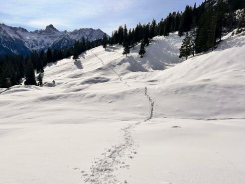 Vom Hochplateau Tschengla geht es mit Schneeschuhen zur Alpe Furkla. Oben angekommen genießen wir die Aussicht bei einem Tee, bevor es wieder retour Richtung Tschengla geht.