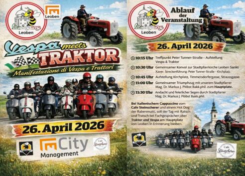 Bereits zum dritten Mal findet die Veranstaltung „Vespa trifft Traktor“ in Leoben statt. Dieses außergewöhnliche Treffen des Kultrollers „Vespa“ und der Arbeitsmaschine „Traktor“ ist eine schöne Gelegenheit, Tradition und Mobilitätskultur in geselliger Atmosphäre zu verbinden.