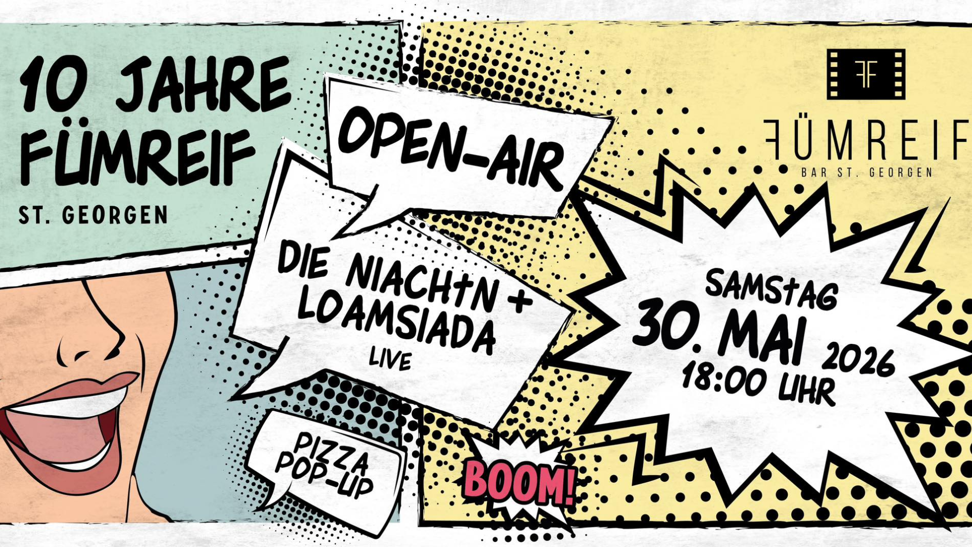 Zu unserem 10. Geburtstag gönnen wir uns ein OPEN-AIR EVENT.10 Jahre Fümreif muss gefeiert werden – und zwar richtig!Freut euch auf ein großes Open-Air mit allem, was dazugehört.* Live on Stage: Die Niachtn & Loamsiada