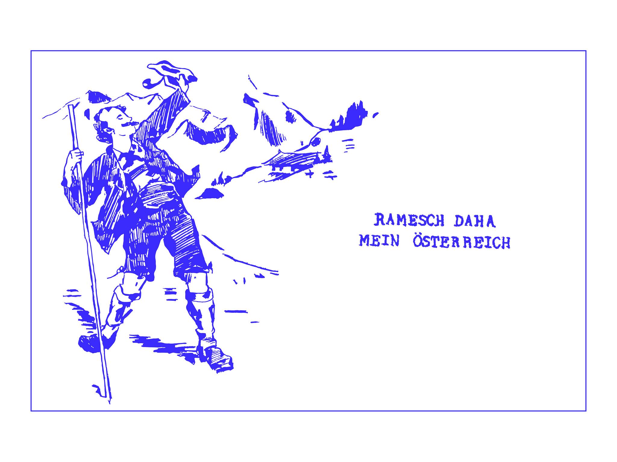 Die Malerin und Konzeptkünstlerin Ramesch Daha widmet ihre erste institutionelle Einzelausstellung in Österreich dem Land, in dem sie lebt. Für die Schau Mein Österreich entstand eine raumgreifende neue Werkserie, für die Daha Motive von Postkarten in großformatige Wandmalereien überführt hat.