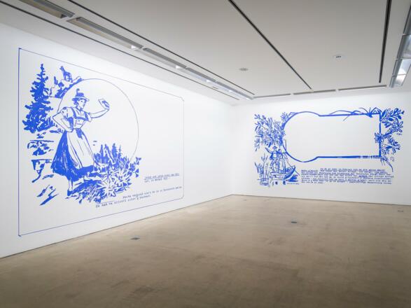 Das TAXISPALAIS war zeitweilig ein Postamt. Die weltweit erste Postkarte wurde im Habsburgerreich versandt. Seitdem stellen Postkarten Österreich als Land prächtiger Berge und verschneiter Landschaften, schöner Flüsse und glücklicher Menschen dar. Ihrem ortsspezifischen Ansatz folgend hat Daha eine tirolspezifische Auswahl historischer Postkarten mit ihrer charakteristischen „Blaupausen“-Maltechnik kopiert und sie danach in Blau auf die Wände des TAXISPALAIS gemalt. Hinzugefügte Texte notieren die Stimmen von Zeitzeug_innen des Austrofaschismus in Tirol. Nichts ist hier erfunden, alles erscheint vertraut und unheimlich zugleich. Dahas Wandmalereien rufen Brecht’sche Verfremdungseffekte hervor. Sehen wird vom Denken unterbrochen und das Denken stößt sich am Sehen.
