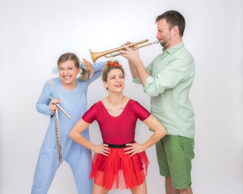 Nach dem Konzert dürfen Instrumente auch ausprobiert werden, das »Trio Pfiffikus« hilft euch dabei.