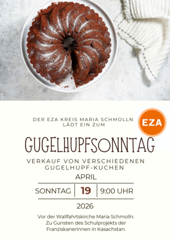 Der EZA-Kreis lädt herzlich zum Gottesdienst um 08:30 Uhr und anschließendem Verkauf von verschiedenen Gugelhupf-Kuchen nach dem Gottesdienst für das Schulprojekt der Franziskanerinnen in Kasachstan ein. Die Kirchgänger können unterschiedlich große Gugelhupf direkt beim Kirchenausgang erwerben. Die gebackenen Köstlichkeiten gibt es solange der Vorrat reicht.