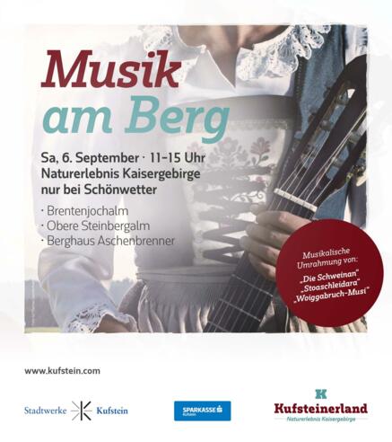 Am Samstag, den 6. September, von 11:00 bis 15:00 Uhr, findet im Naturerlebnis Kaisergebirge das Event Musik am Berg statt – nur bei Schönwetter. An mehreren Hütten sorgen regionale Musikgruppen für stimmungsvolle Unterhaltung: