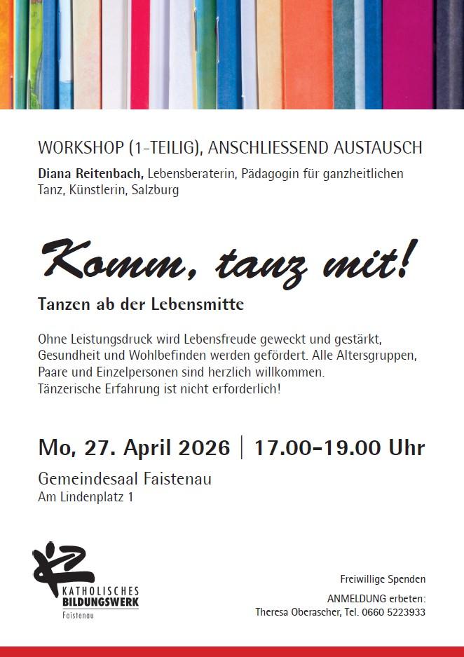Tanzen ab der Lebensmitte im Gemeindesaal Faistenau, freiwillige Spenden und Anmeldung erbeten mit Diana Reitenbach, anschl. Austausch.