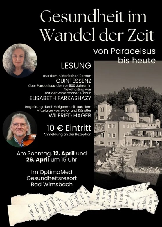 Lesung aus dem historischen Roman Quintessenz über Paracelsus, der vor 500 Jahren in Neydharting war - mit der Wimsbacher Autorin Elisabeth Farkashazy.