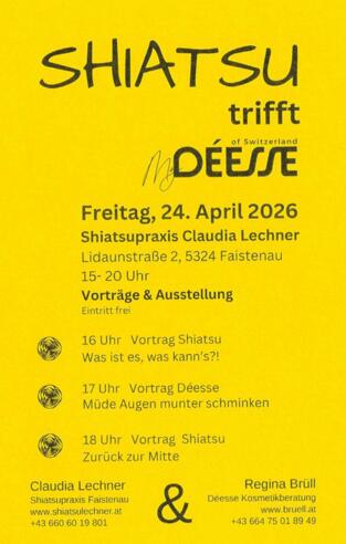 Vorträge & Ausstellung in der Shiatsupraxis von Claudia Lechner, Lidaunstr. 2, Eintritt frei, 16 und 18 Uhr Vortrag Shiatsu, 17 Uhr Déesse.