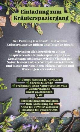 Wir laden dich herzlich zu einem inspirienden Kräuterspaziergang ein. Gemeinsam entdecken wir die Vielfalt der Natur, lernen essbare Wildpflanzen kennen und lassen uns von ihren DÜften, Farben und Wirkungen verzaubern.