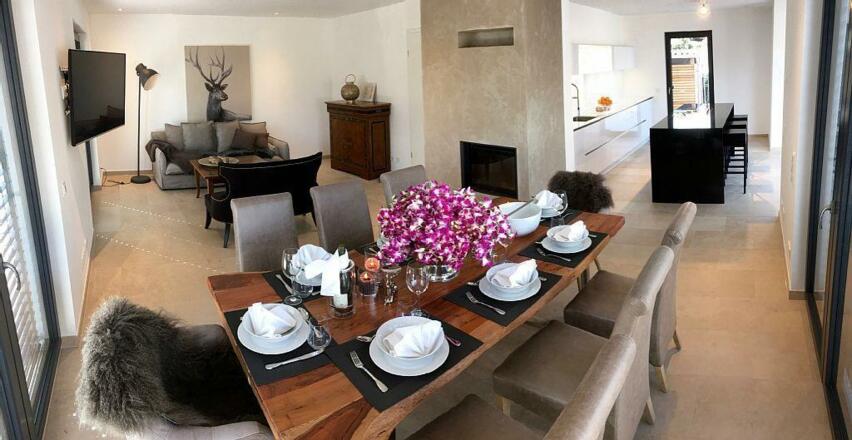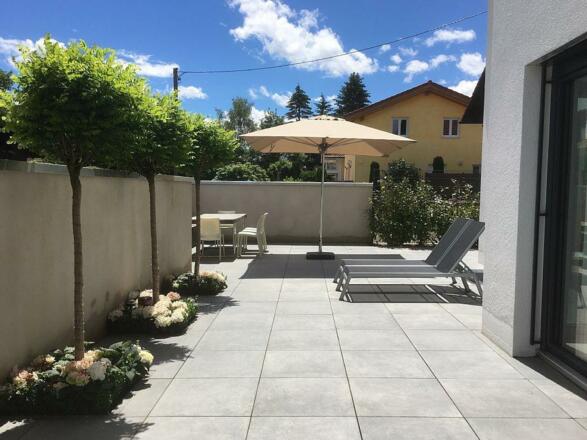 Exklusives und geschmackvolles Ferienhaus im oberbayrischen Loisachtal Achmühle - Das Haus umfaßt eine Wohnfläche von ca. 160m2. Es ist ausgestattet mit 4 Doppelschlafzimmern mit Boxspringbetten, 2 Bädern mit ebenerdigen Natursteinduschen und einem lichtdurchfluteten Wohn- und Essbereich mit Kamin und offener Küche. Im gesamten Wohnbereich ist hochwertiger Naturstein und in den Schlafräumen Echtholzboden verlegt. Der nicht einsehbare Außenbereich, dem seine Natursteinmauer einen Innenhofcharakter verleiht, lädt mit seinen Liegenstühlen und einem großzügigen Essplatz zum Verweilen unter freiem Himmel ein.