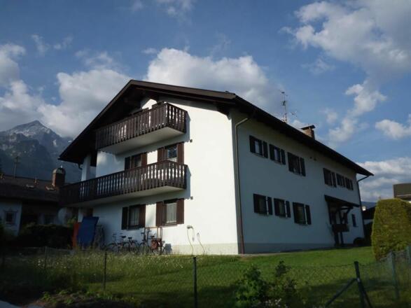 Die Wohnung erstreckt sich über das 1. OG und DG. Unten befindet sich ein großer Flur, ein Badezimmer mit Tageslicht, Dusche, WC und Föhn, eine voll ausgestattete Einbauküche mit Geschirrspüler, 4 Platten Herd mit Backofen, Kühlschrank mit TK- Fach, Toaster, Wasserkocher und Kaffeemaschine, sowie ein großes Wohnzimmer mit Sat-TV, CD- Player, Sitzgruppe und Essplatz. Einer der zwei Balkone (Blick auf die Zugspitze und den Wank) mit Sitzplatz ist vom Wohnzimmer aus zugänglich. Über eine Holztreppe gelangt man ins DG. Im DG mit Holzdecke befindet sich ein geräumiges Schlafzimmer mit 2 getrennten Betten. Auch oben besteht Zugang zu einem weiteren Balkon mit freiem Bergblick (Wank) und Sitzgelegenheiten. Im Keller gibt es die Möglichkeit eine Münz-Waschmaschine und einen Trockner zu benutzen. Die Wohnung ist ideal für zwei Personen geeignet. Die Wohnung ist nicht behindertengerecht.