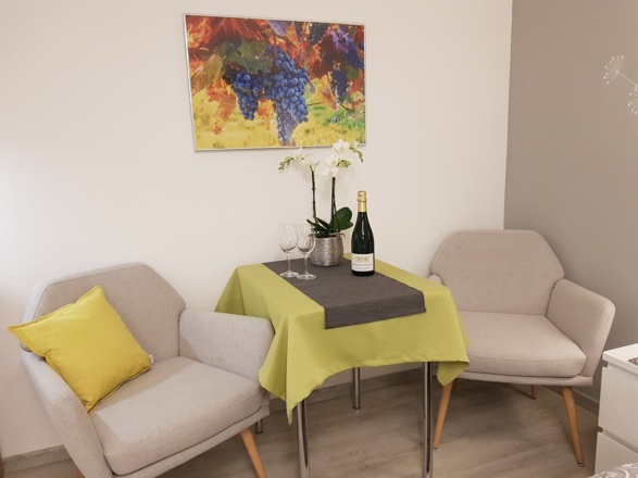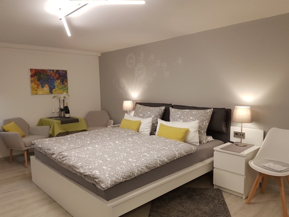Unser schönes & modernes Apartment (ca. 28 qm) ist neu eingerichtet und befindet sich in ruhiger und sonniger Lage.Wir bieten 1 Doppelzimmer (Zustellbett möglich oder auch als EZ buchbar) mit Frühstücksküche, Terrasse und Dusche/WC/Fön. Kostenfreies Lan/Wlan & TV (Magenta). Im Zimmer stehen Wasserkocher und Kaffeemaschine für Sie bereit, täglich Kaffee/Tee und Mineralwasser zur freien Verfügung.Frühstück auf Anfrage, alternativ Café mit Frühstücksangebot im Ort.Radfahrer und Wanderer sind auch für eine Nacht willkommen.Für Ihre Fahrräder ist eine abschließbare Unterstellmöglichkeit vorhanden.Unser Haus verfügt über eine Ladestation für E-Autos.Keine Tiere, Nichtraucher.Vom Haus erreichen Sie in wenigen Schritten den Wald mit dem Waldlehrpfad, den Wanderparkplatz Stutz, die Weinberge und die Mountainbike-Strecke Bürgstadt Bü1. Auch diverse Häckerwirtschaften, Restaurants und die Bushaltestelle sind schnell erreichbar.