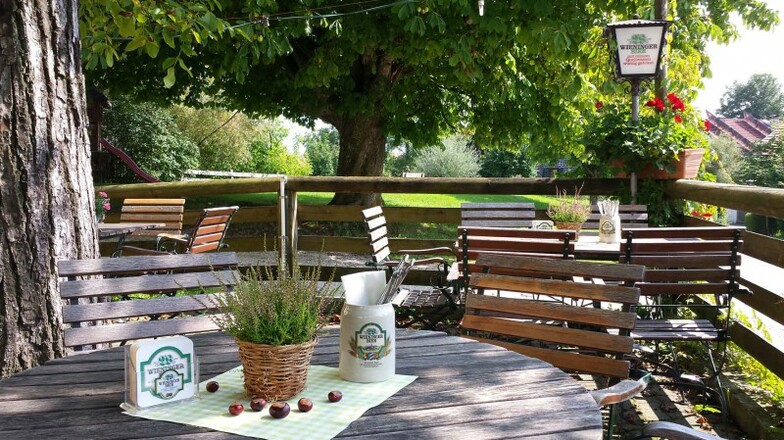 Genießen Sie die schönen Sommertage und -abende in unserem sonnigen Biergarten unter Kastanienbäumen und mit herrlichem Blick auf die Berge bei einem kühlen Bier und einem Schmankerl aus unserer Küche.