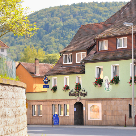 Gemütlichkeit in familiärer Atmosphäre - das bietet der Gasthof Vogel in Pommelsbrunn, direkt an der Goldenen Straße, inmitten der Frankenalb. Lassen Sie sich mit guter Küche, fränkischen Schmankerln und deftiger Hausmannskost verwöhnen! Der Gasthof Vogel ist Mitglied bei Heimat auf'm Teller. Für Urlauber, Geschäftsreisende und Messegäste gibt es gepflegte Pensionszimmer (mit Dusche/WC und teilw. TV, 7 Doppelzimmer, 4 Einzelzimmer). Vorhanden sind auch ein Fernseh- und Aufenthaltsraum sowie eine große Terrasse. Sie finden hier Nebenräume für Gesellschafts- und Familienfeiern. Busse sind herzlich willkommen. Öffnungszeiten:Dienstag bis Freitag: 10:00 - 14:30 Uhr und 17:00 - 22:30 Uhr, Samstag, Sonn- und Feiertag durchgehend geöffnetMontag Ruhetag. Plätze innen: 140