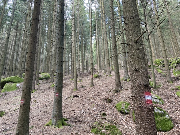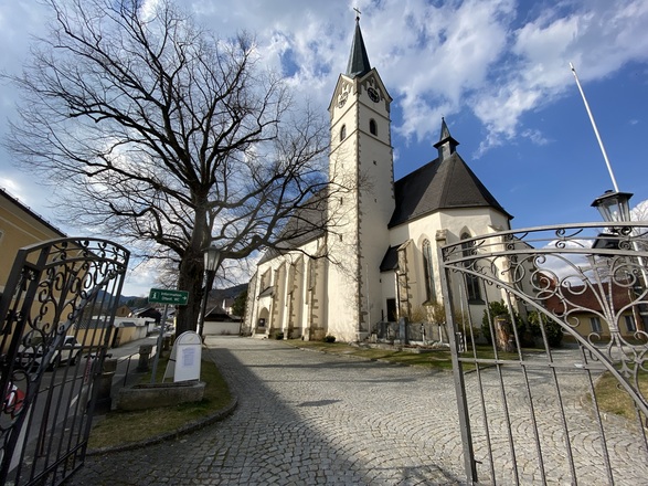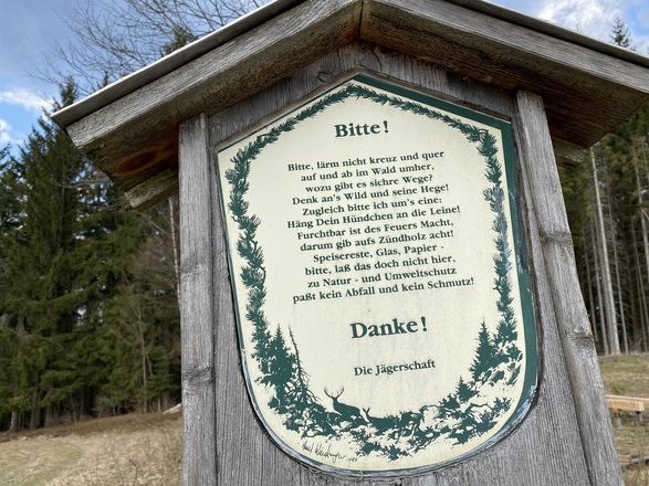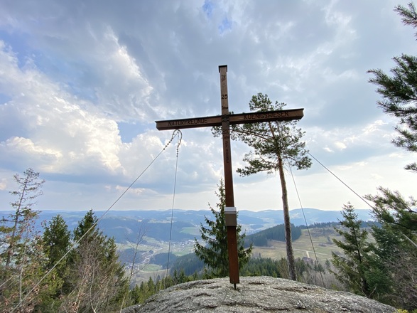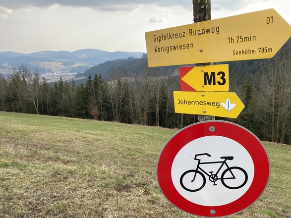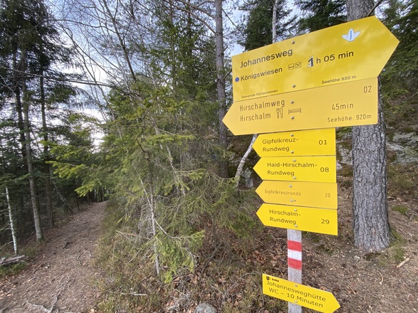 Vom Marktplatz starten und an der Kirche und Raiffeisenbank vorbei, hinauf Richtung Schulzentrum. Nach dem Karlingerhaus nach einer starken Links- und einer starken Rechtskurve rechts auf den Waldweg einbiegen. Knappe 400 Hm geht es auf einem sehr schönen Waldwanderweg hinauf zum Gipfelkreuz. Von dort der Beschilderung weiter folgen, an der Johannesweghütte vorbei und über den Johannesweg zurück bis Königswiesen.