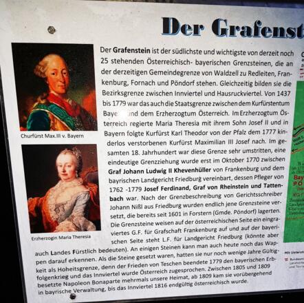 Das Mitte juli 2022 neu errichtete Grafensteindenkmal steht am Grenzpunkt von den Gemeinden Fornach, Waldzell und Pöndorf. An diesen historischen Punkt führte über 300 Jahre die Landesgrenze zwischen Bayern und Österreich vorbei. 25 Grenzsteine gibt es noch, sind jedoch schwer zu finden. Beim südlichsten Grenzstein wurde diese Gedenkstätte errichtet. Ein Hinweisschild (siehe Foto) gibt eine genaue Erläuterung über diesen historischen Ort.