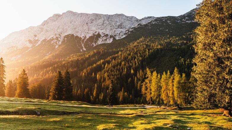 Start der Gravelbike-Tour ins Gaistal ist am Informationszentrum Seefeld direkt neben dem Bahnhof. Von dort aus fährt man Richtung Leutasch aus Seefeld heraus, radelt ein kurzes Stück abseits der Straße auf kleinen Wegen und schließlich entweder auf Asphalt oder Schotter abseits der Straße durch den Ortsteil Neuleutasch. Nun geht es ein kurzes Stück bergab, bis man in Weidach in Leutasch ankommt. Hier hält man sich links in Richtung Westen und fährt nun mit schönsten Blicken auf die Hohe Munde immer entlang der Leutascher Ache das sonnige Tal hinauf. Auch auf diesem Abschnitt kann man sich entscheiden, ob man lieber auf schnellem Asphalt oder im schattigen Wald auf Schotter fahren will. Nach wenigen Kilometern, die nur leicht bergauf führen, hält man sich weiter geradeaus Richtung Gaistal. Weiterhin leicht steigend fährt man bis zum Eingang des wunderschönen Tals, das als Almenparadiesbekannt ist.