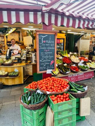 Unweit der historischen Schrannenhalle, der ehemaligen Getreidehalle am Rande der Altstadt, plätschert das Wasser gemächlich im Karl-Valentin-Brunnen vor sich hin. Direkt daneben liegt der auffallend liebevoll dekorierte Marktstand von Gut zum Leben. Der Höfe-Verbund aus dem Spessart betreibt eine ökologische Landwirtschaft, die weit über die gebräuchlichen Bio-Standards hinausgeht.