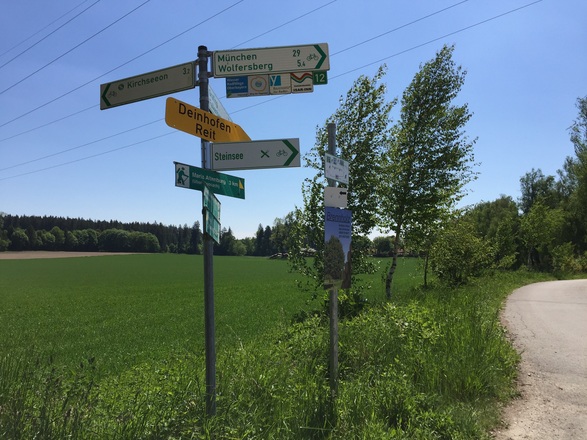 Schöne Tour mit Panoramablick auf die Berge. Teilweise gut befahrbare Forstwege, Straßen mit wenig Verkehr. Abfahrt von Fürmoosen nach Taglaching, hier der erste Alpenblick. Wunderbare Aussicht bei Alxing. Größere Steigung von Moosach zum Steinsee.