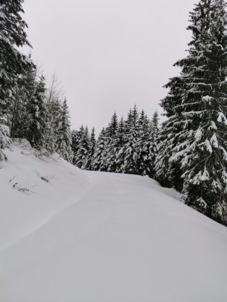 Richtung süden - ein Stück auf der Familienabfahrt Alpenblick. Nach ca. 600 m in einer starken Linkskurve, rechts abbiegen und durch den Wald abfahren. Weiter richtung Bödenegg und Gütle.