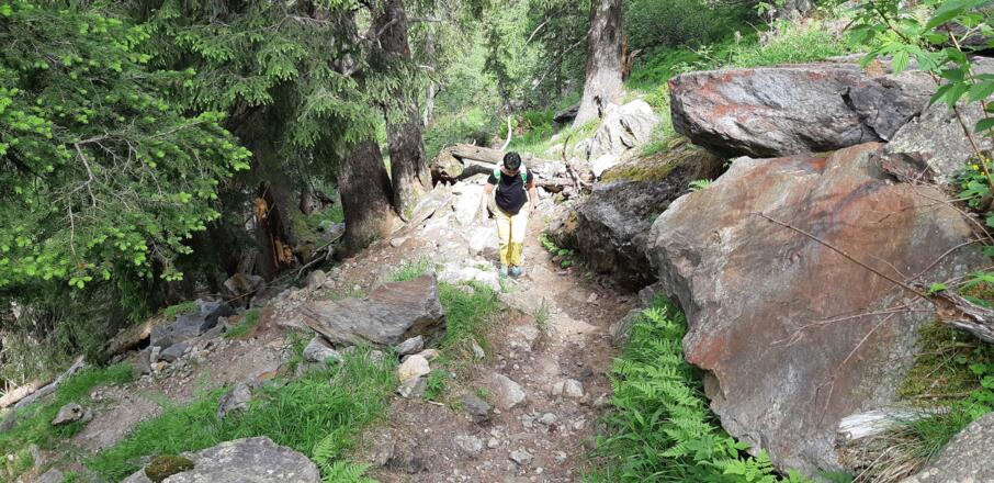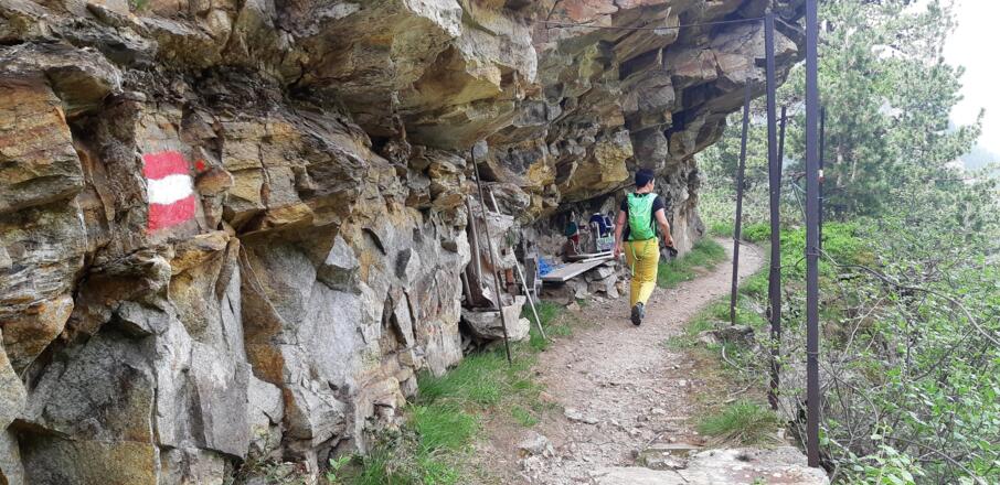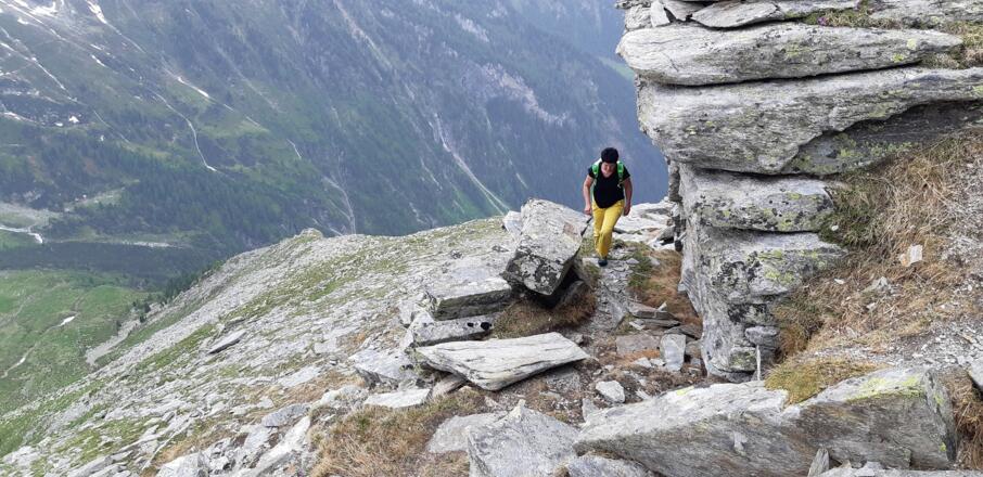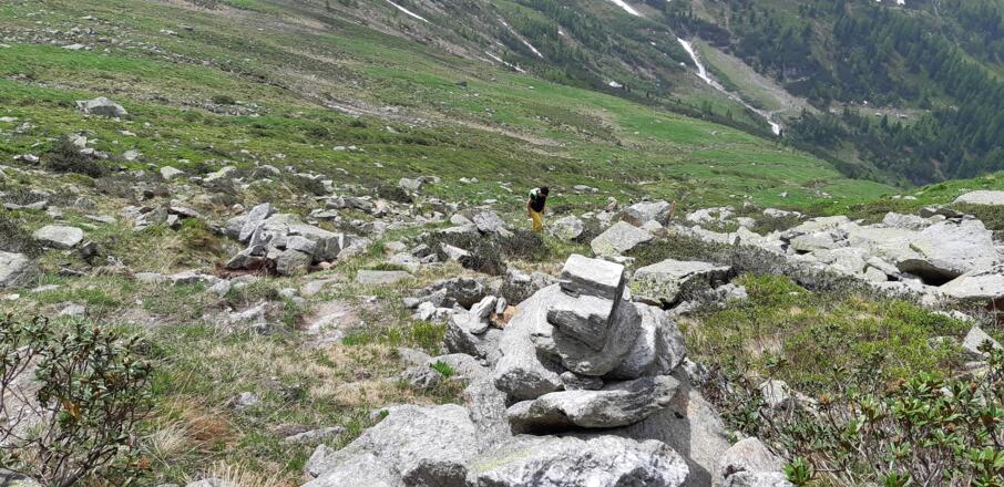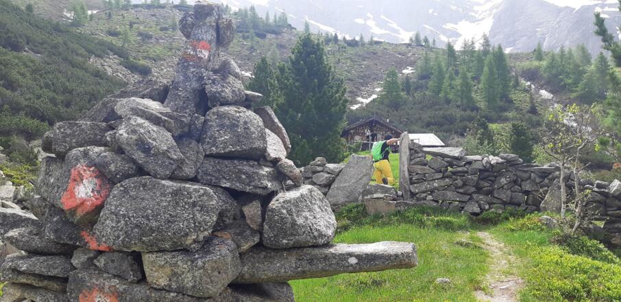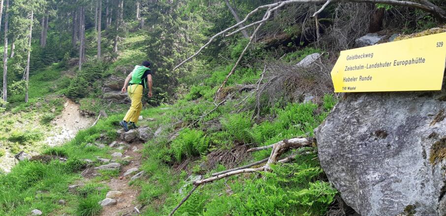 Vom Parkplatz geht es taleinwärts auf der Forststraße, vorbei an einem Almdorf (Nockeralm) bis zur beschilderten Abzweigung (Geisterbecksteig, Landshuter-Europahütte Habeler Runde). Wir biegen auf einen perfekt gewarteten Bergweg ein, queren zwei kleine Wasserfälle und gelangen in den Latschengürtel. Bei einer Weggabelung dem deutlich markierten Pfeil nach links folgen und die Zeischalm mit den beeindruckenden Bauten aus Stein, die der Almbesitzer Erich Gatt geschaffen hat, ist bald erreicht.
