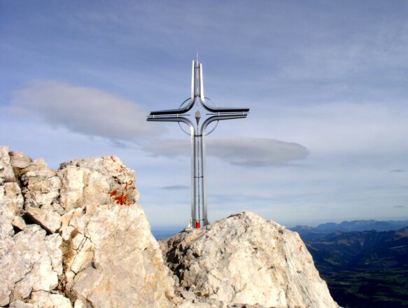 Wie steigen an zur Abzweigtafel "Schusterweg" auf 2253 m und folgen rechts dem Weg 452 zu einer Scharte um 2380 m. Über schroffes Gehgelände erreicht wird das schöne Gipfelkreuz vom Hohen Göll (2522 m) mit einem grandiosen Panorama. 1575 HM und flott 3 1/4 Std. Gehzeit.
