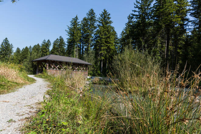 Wegkreuzung: rechts dem Weg in Richtung Paspels, Baggerseen, folgen.