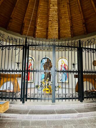 Auf dem Vorplatz befinden sich mehrere Sitzmöglichkeiten, ein großer Kruzifix und eine Holzskulptur der Mutter Gottes. Im Inneren kann die namensgebende Josefsfigur mit Christuskind begutachtet werden.