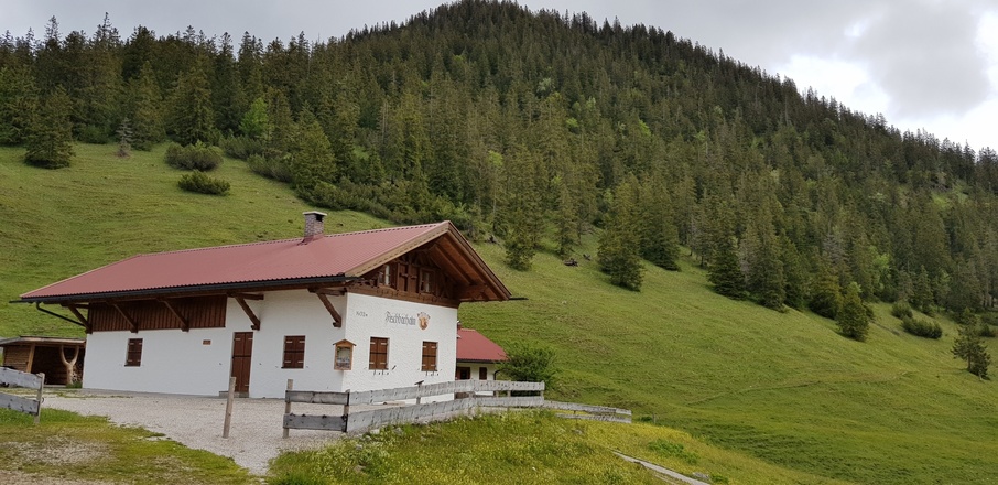 Wir starten an der Isar mit der Schöttelkarspitze fest im Blick, noch in der Ferne. Zunächst geht es über breite Forststraßen durch den schönen Mischwald, bis wir nach gut 500 Höhenmetern die Fischbachalm erreichen. Anfang Juni konnten wir hier noch nicht einkehen, sondern lediglich in der viel tiefer gelegenen Auhütte.