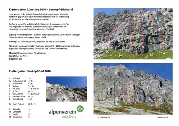 Leider wurden in der Seekopf-Ostwand die Kletterrouten wegen Steinschlag behördlich gepserrt. Vor einigen Jahren ist aber in der Seekopf-Südwand, auf halbem Weg zur Totalphütte, ein toller Klettergarten entstanden. Der Fels ist rau, griffig und bietet allerlei Klettereien für mindestens einen Tag- Wer länger Zeit hat, kann sich hier schon für die langen Kletterrouten am Hüttenkopf, neben der Totalphütte einklettern.