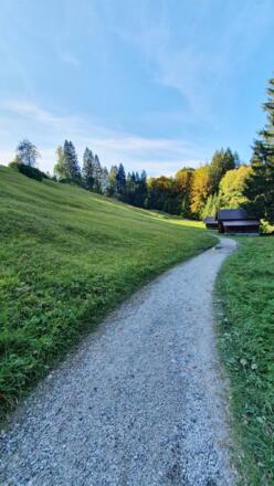 Es erwartet dich ein steiler Anstieg. Sobald du diesen gemeistert hast, führt dich ein schöner Schwotterweg leicht bergab zur Kochelbergalm.