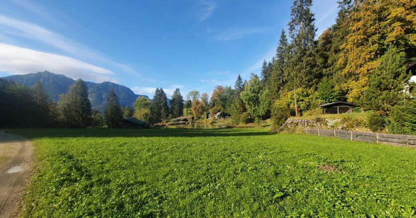 Vor der Pferdeweide führt rechts querfeldein ein Trampelpfad mit traumhaftem Blick auf den Wank.