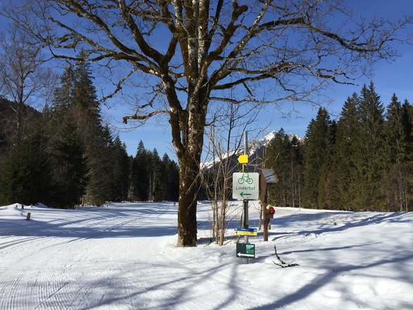 Der Einstieg in Graswang beim Wanderparkplatz ist total eben. Anfangs führt die Loipe an der Bundesstraße entlang, dann ruhig durch Wald und über Lichtungen mit Blick ins Ammergebirge. Eine Schwierigkeit könnte sein, bei der Brücke über die Linder. Die Loipe führt unter der Brücke durch, quert die zugeschneite Linder und geht auf der anderen Seite vom Bachbett wieder hoch. Bei guter Schneelage ist die Steigung machbar. Wem das zu steil ist kann am linken Ufer der Linder wieder zurück fahren. Ansonsten führt die Loipe unwesentlich bis nach Linderhof leicht bergauf. Am Ortsschild Linderhof ist leider Ende, denn um das Schloss zu sehen, müsste man die Straße queren und hier liegt kein Schnee.