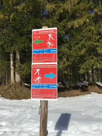 Gerade weiter kommt man nochmal durch das Flußbett mit super Ausblick ins Tal zur Dickelschwaigrunde. Auf der Dickelschwaigrunde queren wir die Straße zur Gertrudiskapelle und umrunden diese bergauf. An der Straßenquerung links über die Brücke käme man zur Graswangloipe Richtung Ettal, hier liegt aber eventuell kein Schnee auf der Brücke. Die Dickelschwaigrunde führt wieder zurück über eine Brücke ins Bachbett und geht nun leicht bergauf bis zum Abzweig rechts zum Parkplatz.