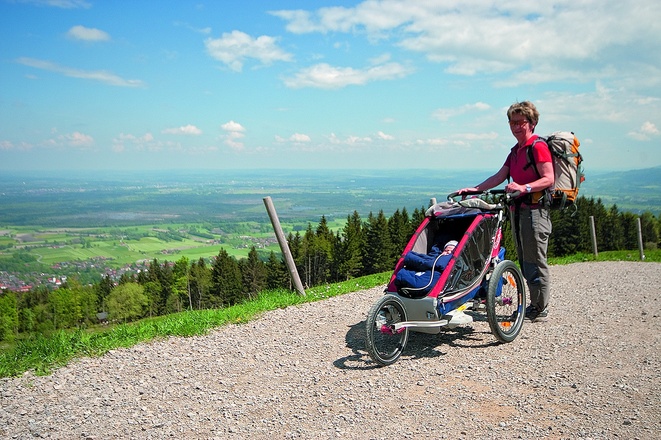 - Eine besonders geländegängige Version des Kinderwagens ist der Gogo. Diese relativ teure zweirädrige Karre lohnt sich, wenn man besonders viel in den Bergen unterwegs ist. Der Gogo kann sowohl geschoben als auch gezogen werden, was bei steilen Anstiegen von Vorteil ist. Zudem ist er außerordentlich leicht, schnell und klein verstaubar. Ein weiterer Pluspunkt sind die großen Gummireifen. Den Gogo sollte man jedoch erst für Kinder ab circa 4 Monaten verwenden, da die Kinder beim Ziehen stark gekippt sind und fast liegen. Bis zum Sitzalter sollte man holpriges Gelände meiden.