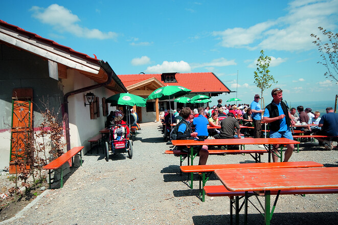 Die Alm bietet kalte und warme Gerichte und für den Nachwuchs Sandkasten und Wickeltisch. Auf der Strecke stehen Bänke zum Ausrasten oder Stillen.