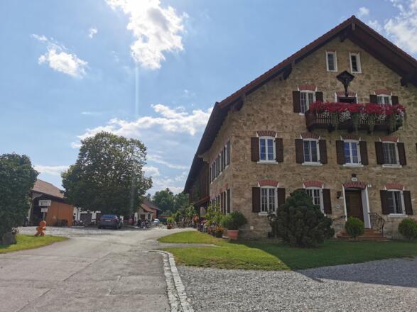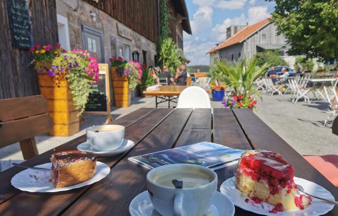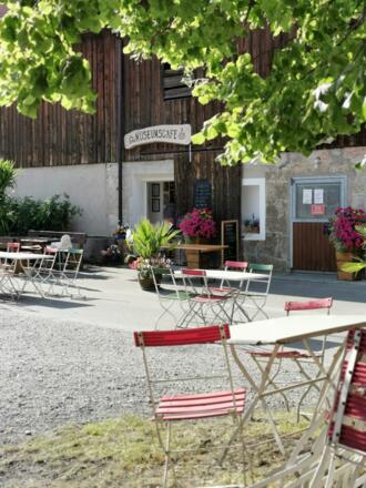 Was? Hier kommt noch ein Café? Zur Sicherheit ein Blick aufs Navi. Ja, tatsächlich, wir sind auf dem richtigen Weg. Und nach der nächsten Kurve ist das Ziel auch schon zu sehen. Ein riesengroßer Gutshof. Inmitten herrlicher Landschaft und mit grandiosem Alpenblick. Platz ist hier jede Menge. Und Ruhe. Aber noch viel grandioser sind die Kuchenstücke, die es hier gibt. Riesengroß und unverschämt gut. Natürlich täglich selbst gebacken mit regionalen Zutaten in Bioqualität. Die Chefin und Bäckerin Gabi hat das Backhandwerk absolut im Blut. Das bestätigt sich, als sie mir verrät, dass ein jeder Kuchen, eine jede Torte im Grunde ein Einzelstück sei, da sie die Zutaten immer rein nach Gefühl beimenge. Alle Achtung. Auch recherchiert sie täglich im Internet, welche Neuigkeiten es im Backhandwerk gäbe, da sie es liebe, dies dann sofort selbst auszuprobieren. Und so kann es gut passieren, dass man hier völlig neue Kuchen- und Tortenkreationen bestaunen und kosten kann. Und wer sich im Anschluss noch für altes und traditionelles landwirtschaftliches Gerät interessiert, der wirft einen Blick in das Museum, in dem auf einem Raum unglaublich viele historische Gerätschaften entdeckt werden können. Zurück im Freien geht es im entspannt-zufriedenen Schlenderschritt zurück zum Parkplatz. Das Fazit des Nachmittages: Verweilen leichtgemacht.