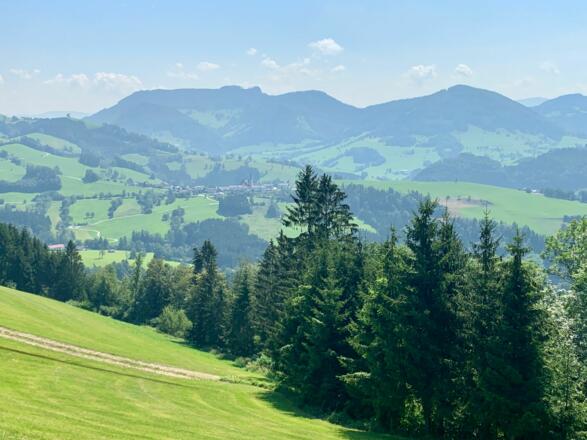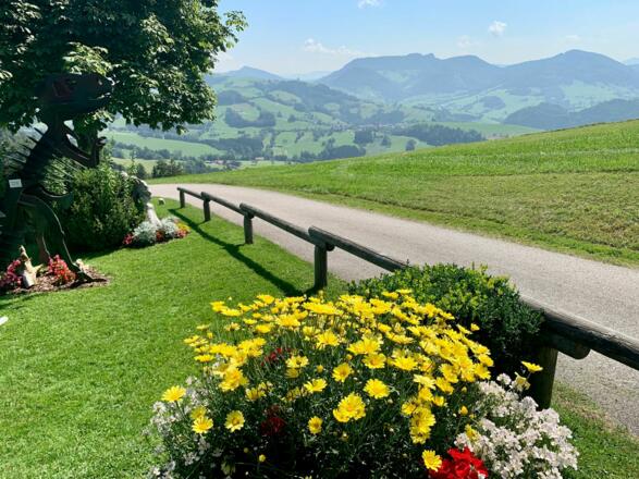 Auf der Rastbank beim Gipfelkreuz genießt man die Gipfelschau auf Hallermauern, Sengsengebirge und das Gebiet des Nationalpark Kalkalpen.