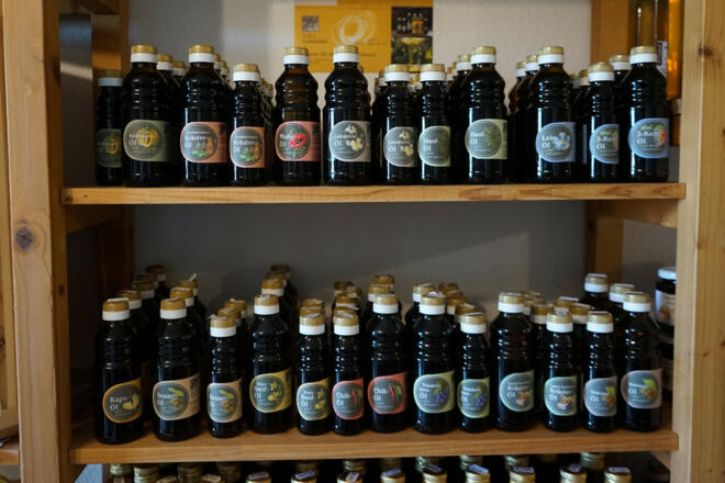 Neben den verschiedensten Ölen werden auch Mehl, Essig und viele weitere Köstlichkeiten bei der Ölmühle angeboten.
