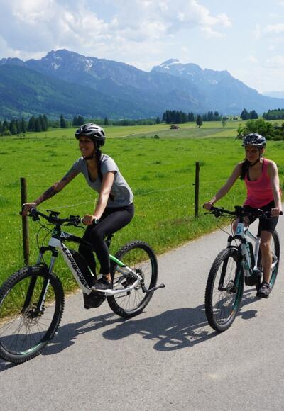 Blick auf die Bannwaldsee-Loipe; im Hintergrund die Thannheimer Berge (links) und der Aggenstein (rechts)