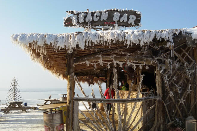 Auch im Winter ist bei gutem Wetter die Beachbar geöffnet. Genießen Sie die außergewöhnliche Atmosphäre: Sonnenuntergang im Schnee, Punsch und Feuerkörbe!