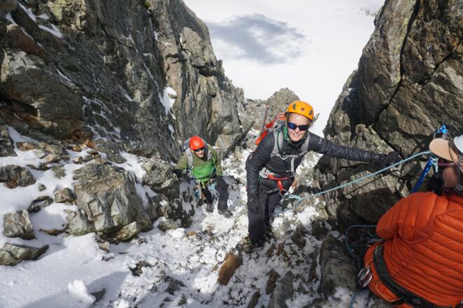 Normale Hochtourenausrüstung ausreichend (Tourenrucksack, steigeisenfeste Bergschuhe, Tourenbekleidung Regenbekleidung, Handschuhe, Stirnlampe, Trinkflasche, Sonnenschutz, Biwaksack, Erste-Hilfe-Beutel, Hüftsitzgurt, Steinschlaghelm, 1 Sicherheitskarabiner Ball-Lock, 2 HMS-Karabiner, 1-2 Expressen, Steigeisen mit Frontalzacken, 2 Eisschrauben (vorsichtshalber), Eispickel, je eine lange und kurze Prusikschlinge, 2-3 Bandschlingen.